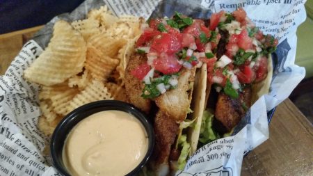 My dining partner decided on the fish tacos. Chef Tommy does something unique with his fish tacos and changes the fish up daily; whatever he gets in fresh that day is what goes in the taco. For the day of our visit it was grouper. He does his fish tacos “double-decker” style; a hard shell taco with a flour tortilla on the outside. Chef Tommy seasons the grouper with blackening spice and cumin and then grills it. It’s all loaded in the taco and topped with shredded lettuce and house made pico de gallo. It also comes with a side of Sriracha mayo. The fish was beautifully cooked and flaky. The spice had a little heat, but not overwhelming. The pico was good, but a little too much cilantro for me, but I’m not a huge fan of cilantro anyway. If you love cilantro, then this pico is right up your alley. All in all, this was a great fish taco, great texture throughout, and bold flavors in every bite.