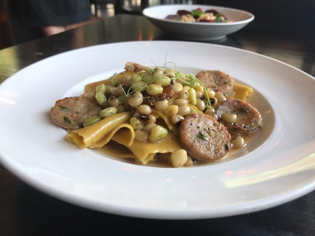 Rabbit Pappardelle (housemade rabbit sausage, handcrafted pappardelle pasta, fresh lemon zest, local field peas, coated in rabbit jus) – If you’ve never tried rabbit before, this is the perfect gateway dish to becoming a rabbit meat lover. Both pasta and sausage aficionados will be delighted to dive into this plate. The sausage flavor is very meat forward with subtle appearance from flavors like chive, garlic, tarragon and Calabrian chili. The pasta is cooked al dente with just the right amount of bounce/chew in each bite.