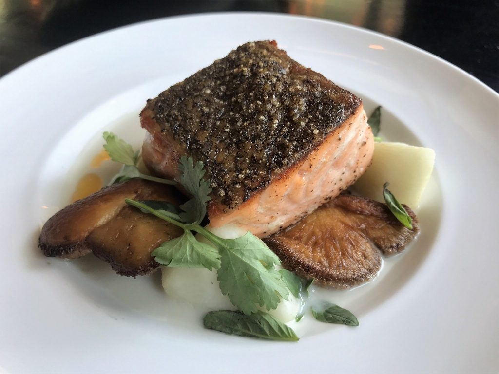 Crispy Skin Salmon (seared skin on and served over local lion’s mane mushrooms, grilled fennel, poached turnips with a Thai coconut broth. Garnished with kaffir lime and chili oil) – If you’re a mushroom lover you’ll be in heaven with this dish. The Lion’s mane mushrooms are just divine! They’re full of flavor without being overwhelming and the broth is the perfect complement to both the salmon and the mushrooms. The turnips and grilled fennel are a refreshing change from more commonly used vegetables. The salmon is cooked with well-seasoned and perfectly crispy skin. It is moist throughout and takes on a bit of the flavor from the north. We usually stick to local fish but this dish is so divine we’d make a trip to Black Sheep just for this.