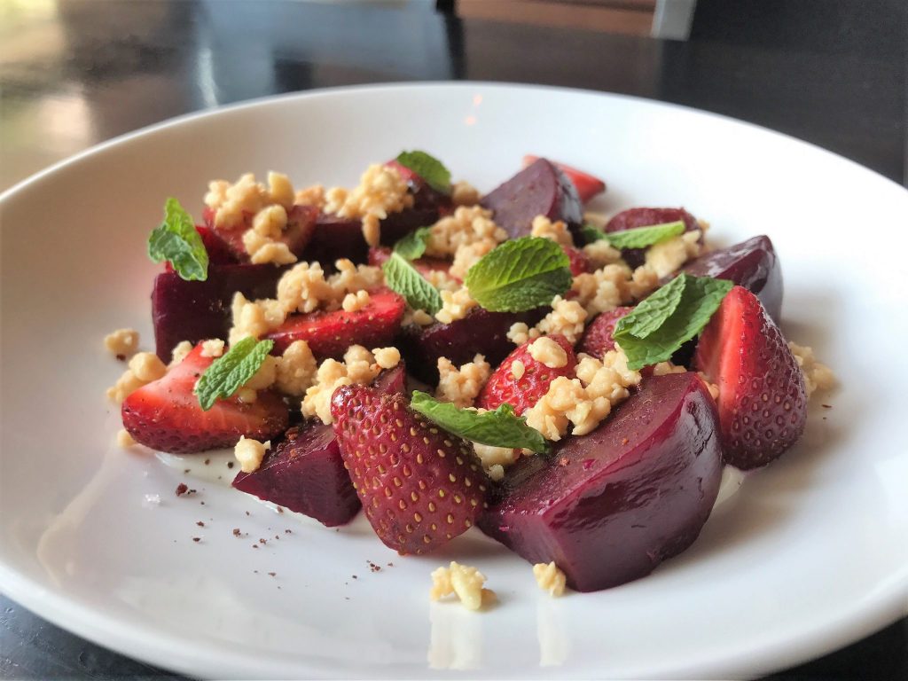 Beets and Labneh Salad (labneh, honey, local strawberries, roasted beets, marcona almonds, sumac, Aleppo pepper, olive oil, mint) – This dish offers up a complex melding of flavors that take your tastebuds on a journey. If you’ve never had labneh cheese before it’s similar to a somewhat savory yogurt with a hint of sweet cheese flavor.