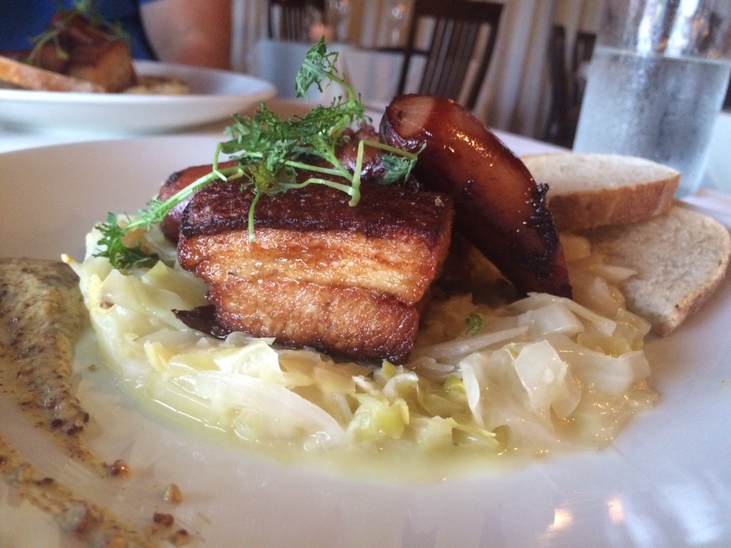 The third course was the most German in influence. It was Choucroute Garnie (Riesling sauerkraut, Strasburg sausage, pork belly, finished with mustard greens and stone ground mustard). The sauerkraut was made in house with cabbage and apple and was aged four and a half weeks. It was the best sauerkraut of our lives, and some of us don’t even like sauerkraut. We all ate it. The pork belly was remarkable. It was crispy on the outside the way God intended and full of flavor. The sausage was anything but average. Eating it any other way than with housemade sauerkraut and pork belly would be an offense to the sausage. The accompanying wine for this dish was Paul Blanck Riesling “Rosenbourg” Alsace, 2014. Typically Riesling is a sweeter wine, but this was dry and acidic wine with lemon and citrus notes. Rosenbourg means it is a single vineyard wine as well.