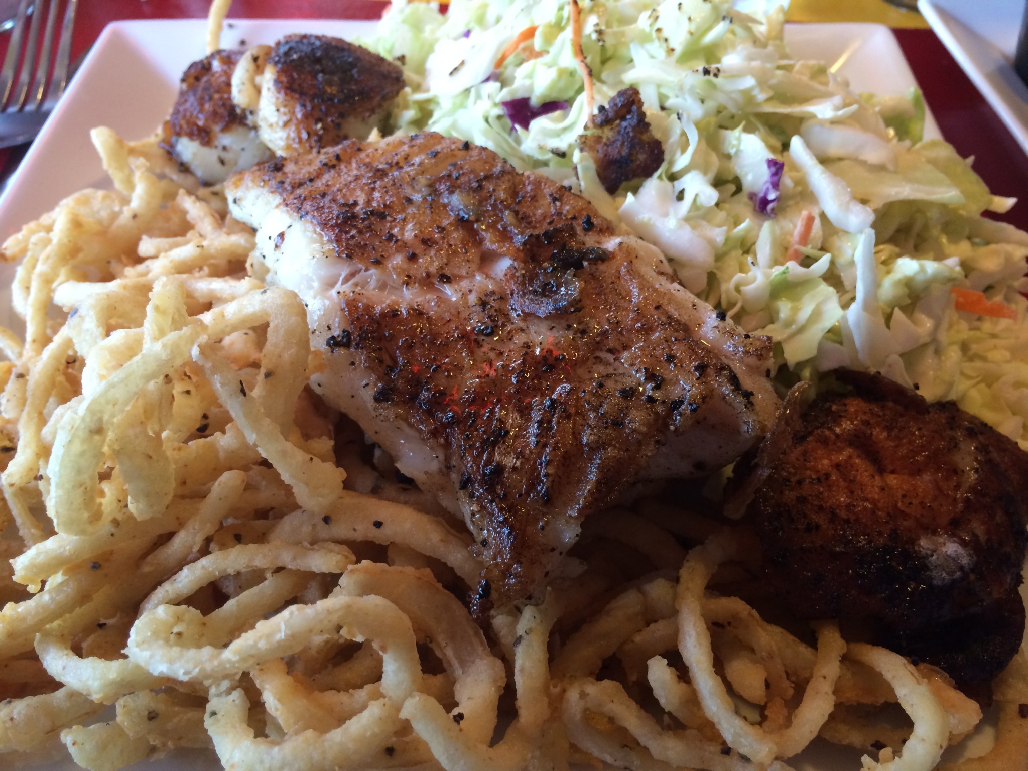 Our final menu choice of the night was the Goofy Foot platter ($21, a combination platter with choice of two Fresh Catch selections and two delicious sides). We chose scallops and grouper, both grilled, with onion straws and mango-wasabi slaw as our sides. The scallops were very good. They had a little bit of seasoning and flavor with the grilling. They were cooked perfectly. The grouper had a little less flavor than the scallops, but was still a good fresh fish. Grouper tends to be like the chicken of fish. It lends itself to whatever preparation it is being used for, it’s great on sandwiches, fried, on salads, in stews, etc. Grilled on its own, grouper is not always the most exciting choice, but it has a firm, easy to eat texture. The onion straws were yummy and not too greasy for a fried food. Our mango-wasabi slaw tasted more like just wasabi slaw. We were really looking for a nice sweet meets spicy balance and we unfortunately couldn’t taste the mango at all. It definitely had a good bit of spice to it, so if you are sensitive to spicy foods be aware.