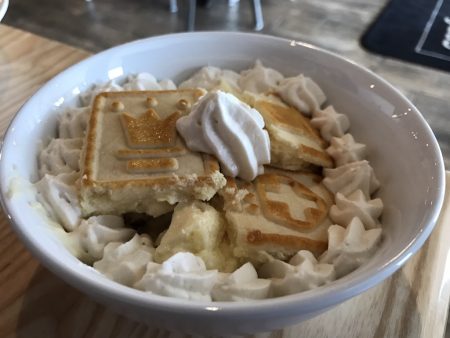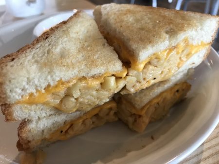 The first entree we dug into was the Gregory’s fried chicken 2 pcs with 2 sides for $14. When the dish arrived you could look at the fried chicken and see it was much darker than usual, indicating it had been overcooked. The slightly burnt taste confirmed that indeed the chicken had been burnt. Not terribly burnt, but the chef definitely should have noticed and not sent it out. The two pieces of chicken were a pretty small leg and thigh which we thought was a pretty terrible value for fried chicken. The chicken was also absurdly salty almost to the point of making it inedible. Hopefully they’ll get the fried chicken figured out over time. The mac n cheese we ordered with the chicken was really good in the spongy but tasty style rather than the super creamy style. I’d definitely dive into the mac n cheese at Comfort again. The other side we ordered with the chicken entree was the watergate salad. This side is traditionally a mix of pineapple, pistachio pudding, marshmallows, pecans and cool whip or whipped cream. This side was tasty and a nice change of pace from the salty and savory tastes thus far in the meal.