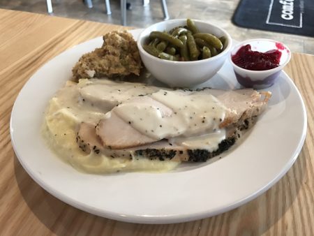 The second entree we ordered was the “Thanksgiving Dinner” which ran $17 for roasted turkey, stuffing, mashed potatoes and gravy, green beans, and cranberry sauce. Never in my life did I expect to send back mashed potatoes, but I guess there’s a first time for everything. These mashed potatoes were so incredibly salty we couldn’t eat them. We almost never send a dish back, but we have a rule that if we’re asked a question we always answer honestly. So if we’re asked if everything was good and it wasn’t we tell whoever asked that there was an issue. Good restaurants want to know when they messed something up so that they can get it right and so that they can make it up to you. Every chef I know absolutely despises the diners who say everything’s great then go home and write a one star yelp review describing how awful the food was. Don’t be that guy! So when the waitress asked if everything was good we told her nicely that the mashed potatoes were so salty that we couldn’t eat them. We honestly should have sent back the fried chicken as well, but it just felt like we’d come across as horribly picky eaters rather than people with a genuine issue. The folks at Comfort handled the issue well offering to replace the mashed potatoes then realizing it would take far too long to remake them. They substituted another side and offered dessert on the house as well. Here’s the kicker though. Half way through our meal we saw some friends of ours walk in. When we finished eating I walked over to their table to say hello. Their food had just arrived and I looked down to see that Comfort had served them the same horribly salty mashed potatoes. I asked how the mashed potatoes were and they said they were entirely too salty. Had the folks at Comfort tasted their sides prior to serving them they’d have realized the potatoes were awful. They would never have served them. When we sent them back they should have tasted them and known to throw them out. The roasted turkey was just okay for us. It tasted pretty salty as well which was likely because it was served on top of the mashed potatoes or maybe the chef just loves salt. The gravy was a white gravy and was okay. The stuffing was pretty middle of the road and something we’d be okay with being served again. The green beans were well seasoned.