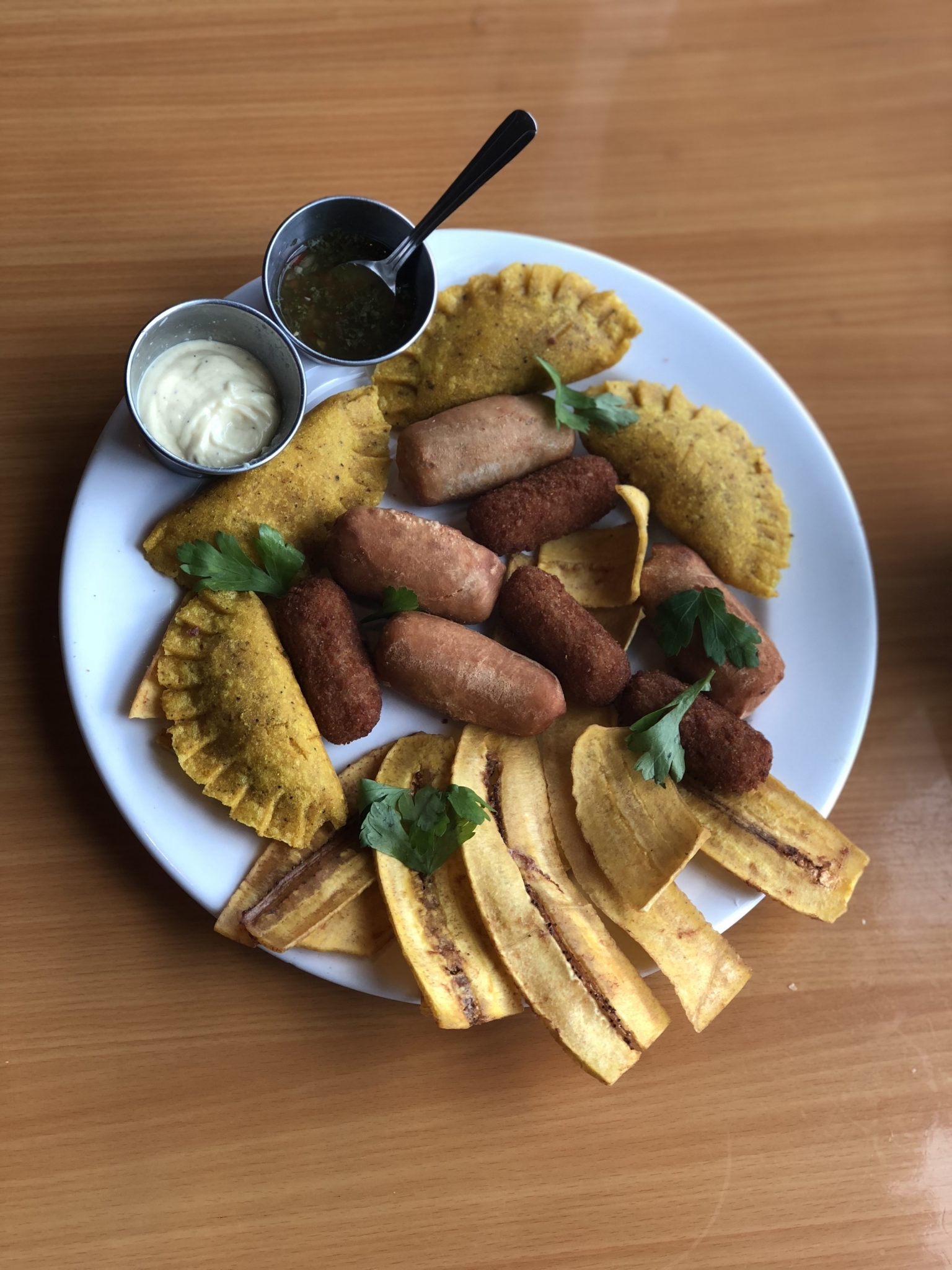 After devouring way too many empanadas (I had to try them all for you guys), we got to try a variety of other things that Laura recommended. Croquettes are something most people are familiar with; little filled, breaded and fried rolls. We tried the cheese and ham. The cheese was my favorite. Who wouldn’t love cheese rolled in bread and fried? I was not a fan of the ham. However, my guest liked the flavor and pointed out that the texture took some getting used to, which is probably why I steered away. I’m weird about some textures. The croquettes were served with the a pickled onion concoction and maracuya sauce, made with the fruit, maracuya, or as we know it, passion fruit. If you’re a fellow sauce-enthusiast, definitely give these a try.