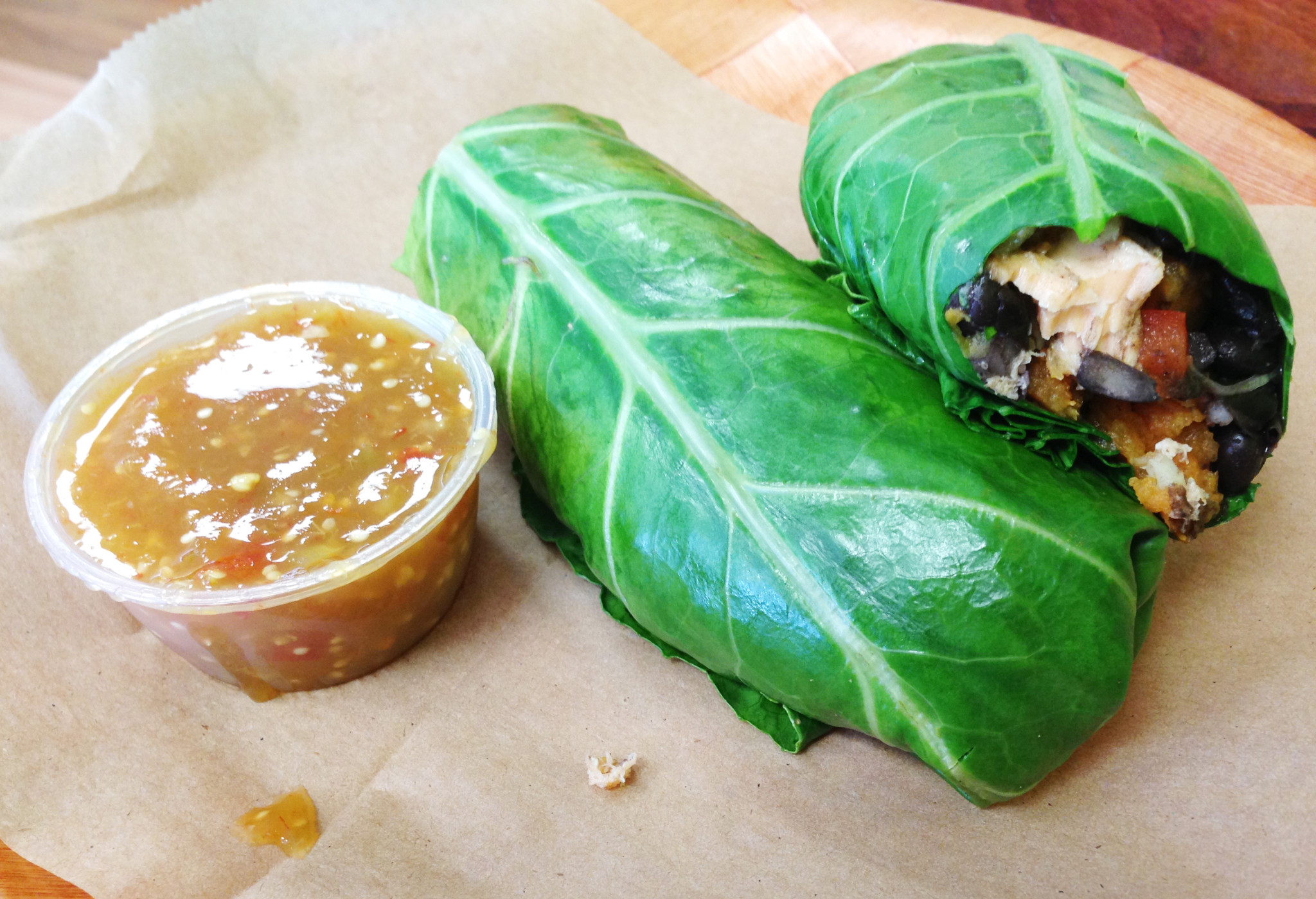 We decided to stay and eat there.  I ordered a small Green Caribbean Smoothie ($3.75) and a Salmon Collard Wrap ($7.75).  For my kiddo, we got a Kid’s Kairos Bowl ($4.95) with chicken and also a Kid’s Strawberry Smoothie ($3.75).  The wait for our food was only a few minutes and then we dug right in.  My Salmon Collard Wrap was delicious. It included perfectly cooked salmon, sweet potato, red peppers, brown rice, green onions, and black beans all wrapped up in a collard leaf.  The salmon was well-seasoned and would have been amazing on its own.  The sweet potato added a nice sweet contrast and the red peppers added some crunch.  The wrap was served with a mango chile dipping sauce.  I was really looking forward to that sweet/hot combination, but all I got was heat.  I tasted no mango flavor at all whatsoever.  It was a bummer because I bet the mango would have gone really well with the salmon.
