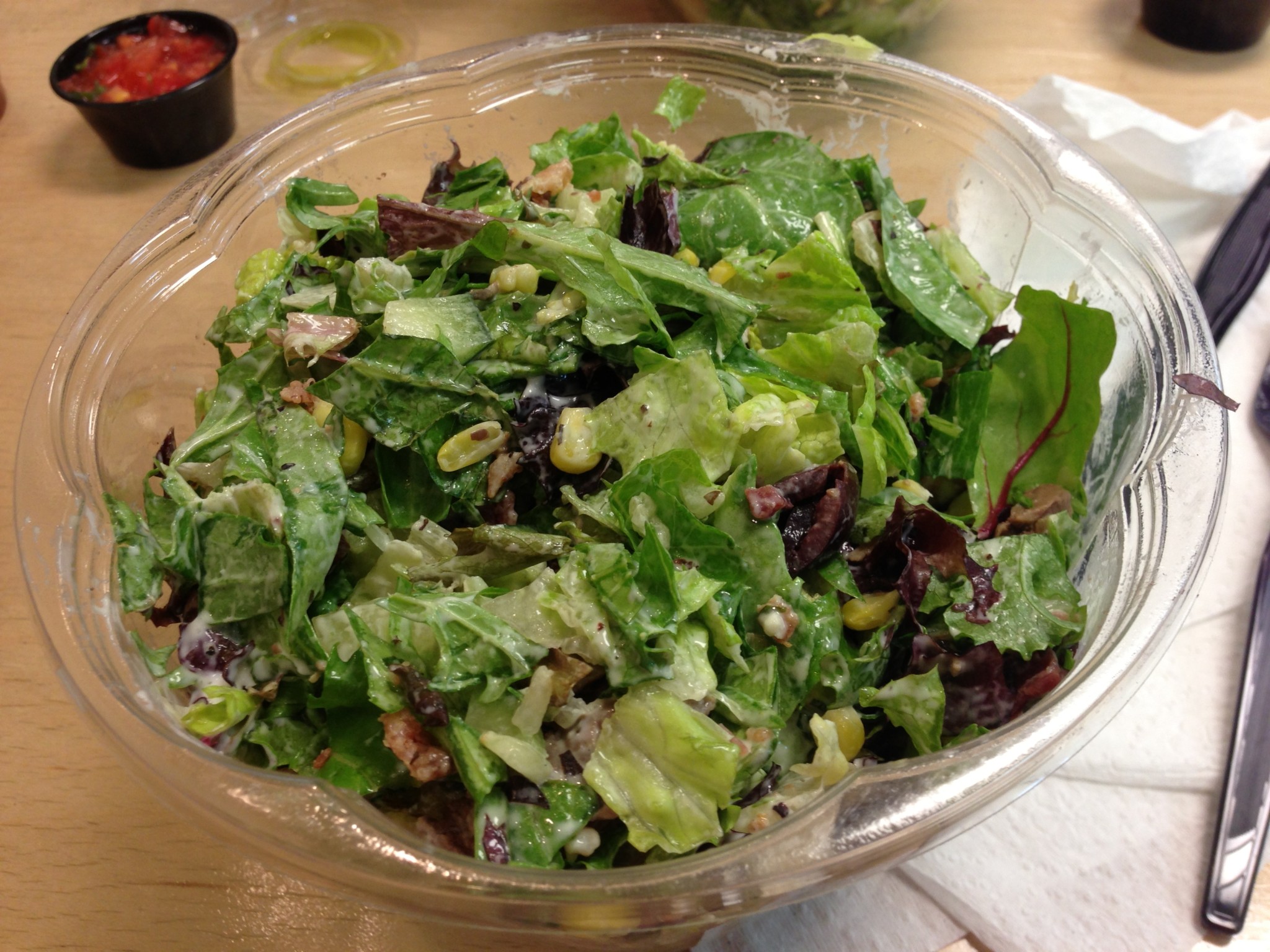 We custom built our salads the day we went to Toss Green. In one salad we had romaine and arugula topped with cucumber, bell pepper, grilled prime sirloin steak, crumbled blue cheese, kalamata olives, and balsamic vinaigrette. It was a good salad, with the exception of the aforementioned ball of blue cheese. The meat was fresh and easily cut with plastic silverware, not hard or tough or dry. The lettuce and veggies were fresh and crisp, no sign of wilting. In the other salad we had romaine topped with corn, black beans, pico de gallo, sour cream, avocado, ancho-chili chicken, lime cilantro vinaigrette and avocado vinaigrette. I’m in the habit of just using salsa or pico de gallo instead of dressing on a southwest flavored salad, but there were so many tempting dressings and sauces that I picked two. They were wonderful, tangy, and stood up on their own, but I also liked them together in my salad. The ancho-chili chicken gave a great spiciness to this salad. It wasn’t overwhelming, but it definitely wasn’t boring. Again all of the lettuce and veggies were fresh and crisp, nothing even close to wilted or brown.