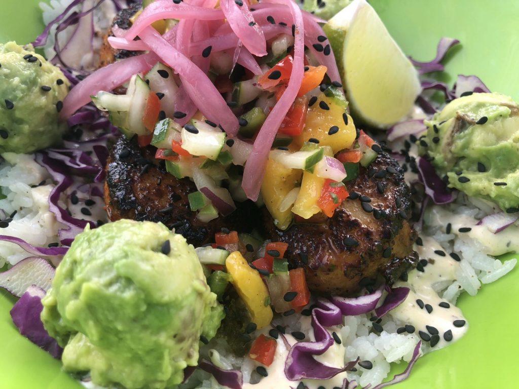 Next up I dove into the blackened scallop sticky rice bowl. I kid you not, these were the largest scallops I’ve seen, even at the nicest of restaurants. There were four (FOUR!) gigantic scallops, perfectly seared sitting on top of jasmine rice, house made mango cucumber salsa, cabbage, pickled red onion, Funk Sauce, pepper jelly, and 4 mini scoops of avocado, garnished with a lime wedge. I could not stop eating it. The sticky rice bowl was everything I wanted, and more. Packed with flavor, filling, and evenly balanced with all the ingredients. It was close to perfection.