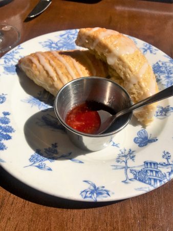 To start brunch we ordered the shrubmosas ($8) and house made scones and jam ($4).  The citrus infused scones were topped with a vanilla glaze and came with strawberry preserves. Perfectly baked – not dry or too sweet and the preserve really complimented the citrus. For those who don’t love super sweet, you will enjoy this. Perfect for sharing.
