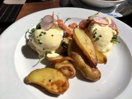 The house smoked salmon benedict came with a large serving of smoked salmon, two soft poached eggs and hollandaise on an English muffin with a side of potatoes Lyonnaise.  The salmon tasted super fresh and had a great smoked flavor and although it was a little too salty by itself, the saltiness was perfect when you combined the egg, greens and sauce.  Probably the best hollandaise I’ve ever had too. The potatoes were cooked perfectly and gave a nice variety to the traditional home fries I would have expected on the dish.