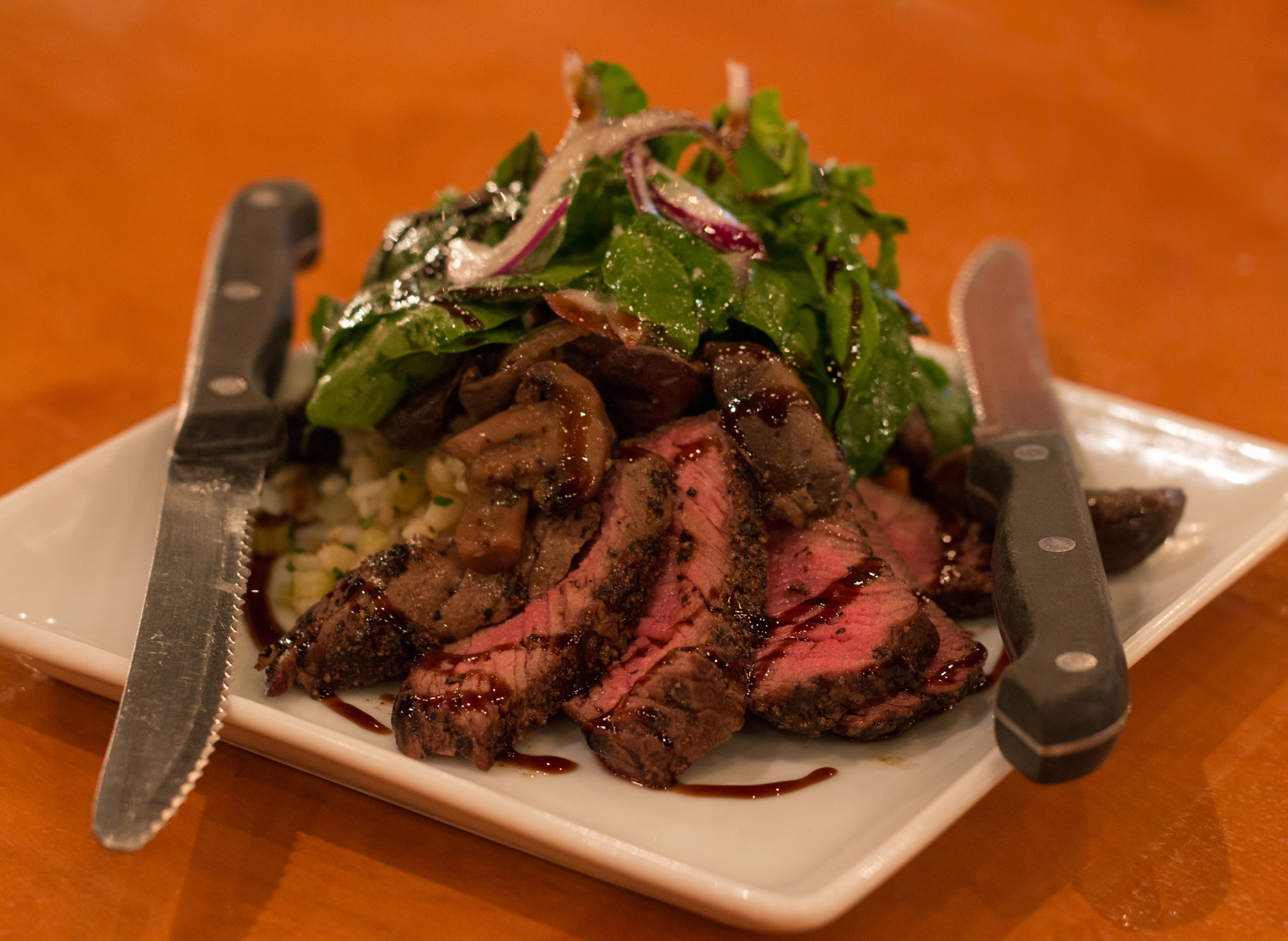 RoyalPalm-BlackAngusSirloinPepper seared black angus sirloin: ($13) This is another entree sized portion and is probably the best deal for high quality steak in town.  The steak temperature was seared perfectly medium for us and served with a side of barley pilaf, portobello & sweet onion confit, and arugula.  While called “peppered” this is a light peppery flavor, so don’t be intimidated if you’re not a huge fan of spice.  The sweet salad was light and refreshing and the barley pilaf had a wonderfully unique texture with the larger barley grains.  I haven’t seen barley on a menu any time recently and loved it as a compliment to the hearty steak.