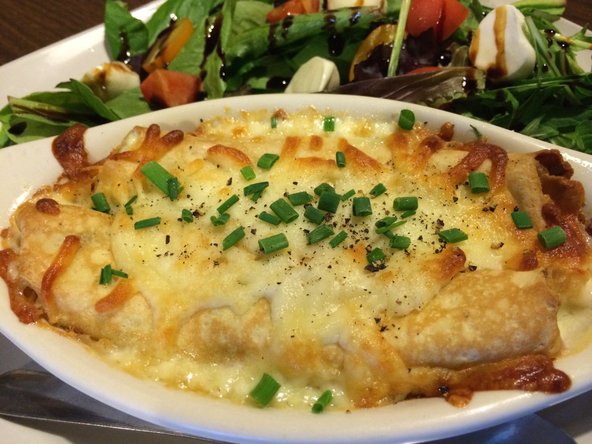 Following the quesadilla we thought we should try some crepes so we opted for the seafood crepes ($12). One of the benefits of overhearing some of the conversation across the restaurant was finding out all their seafood was fresh from Safe Harbor. When Tapa That serves seafood it’s always fresh from Safe Harbor. It’s nice to see local restaurants using fresh local seafood. I’m fairly certain the cheese on top of the crepes was Mozzarella. The crepe filling had that nice sweetness. The seafood in it was tasty. We are fans of this dish. Ready? Here comes our complaint in this review. The balsamic reduction on the salad was too strong. Duh, right? balsamic reduction. We had the same salad on our first visit and the balsamic was great. I’m not sure what happened this time. I was thinking maybe it was a type of dressing I hadn’t had before so we asked the waiter and he confirmed it was balsamic. If you like black licorice you’ll probably love this dressing. I hate black licorice so for my taste it was a bit of an unwelcome surprise. On our previous visit Tapa That told us the banana beignets that were listed on the chalk board weren’t available. They promised this time they’d have the beignets. We had the banana beignets ($4). I’m glad they did because we loved them. The banana was really nicely integrated in to the dough and I’d almost categorize these as a cross between banana bread and beignet. Running out of items seems to be really common at Tapas restaurants. Its probably to be expected and that’s no big deal. We feel however that it would be much less upsetting if restaurants would remove the items from the specials board or let diners know when they’re handed their menu rather than when they request the item.
