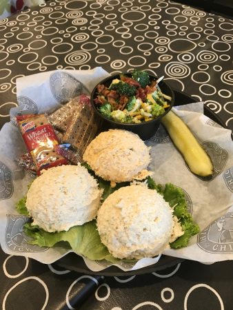 On this visit we tried the Classic Carol, Luau Lydia (with pineapple and macadamia nuts), Mimi’s Mix (Fuji apples and cashews), Dixie Chick (“for the onion lover”), Sassy Scotty (ranch, bacon, and cheddar cheese), and Kickin’ Kay Lynne (buffalo sauce, ranch, bacon, cheddar cheese, and jalapenos) as well as the pasta salad and broccoli salad sides. There are not only myriad options of chicken salad styles but there are also many options for how your chicken salad is served. You can order the chicken salad by the pound, on a sandwich, or served over lettuce (as pictured).