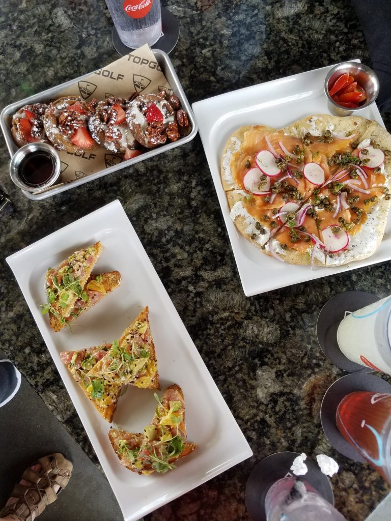 I’ve never been to a Topgolf location before, so when they invited us out to try out their new brunch menu and play a round of Topgolf’s games, I jumped at the chance to live out my Happy Gilmore fantasies. They let us bring up to 6 people for this outing, so fellow JRR writers, Melissa Nolan and Cassie Marie brought their +1’s and joined me and my partner for some food and fun.