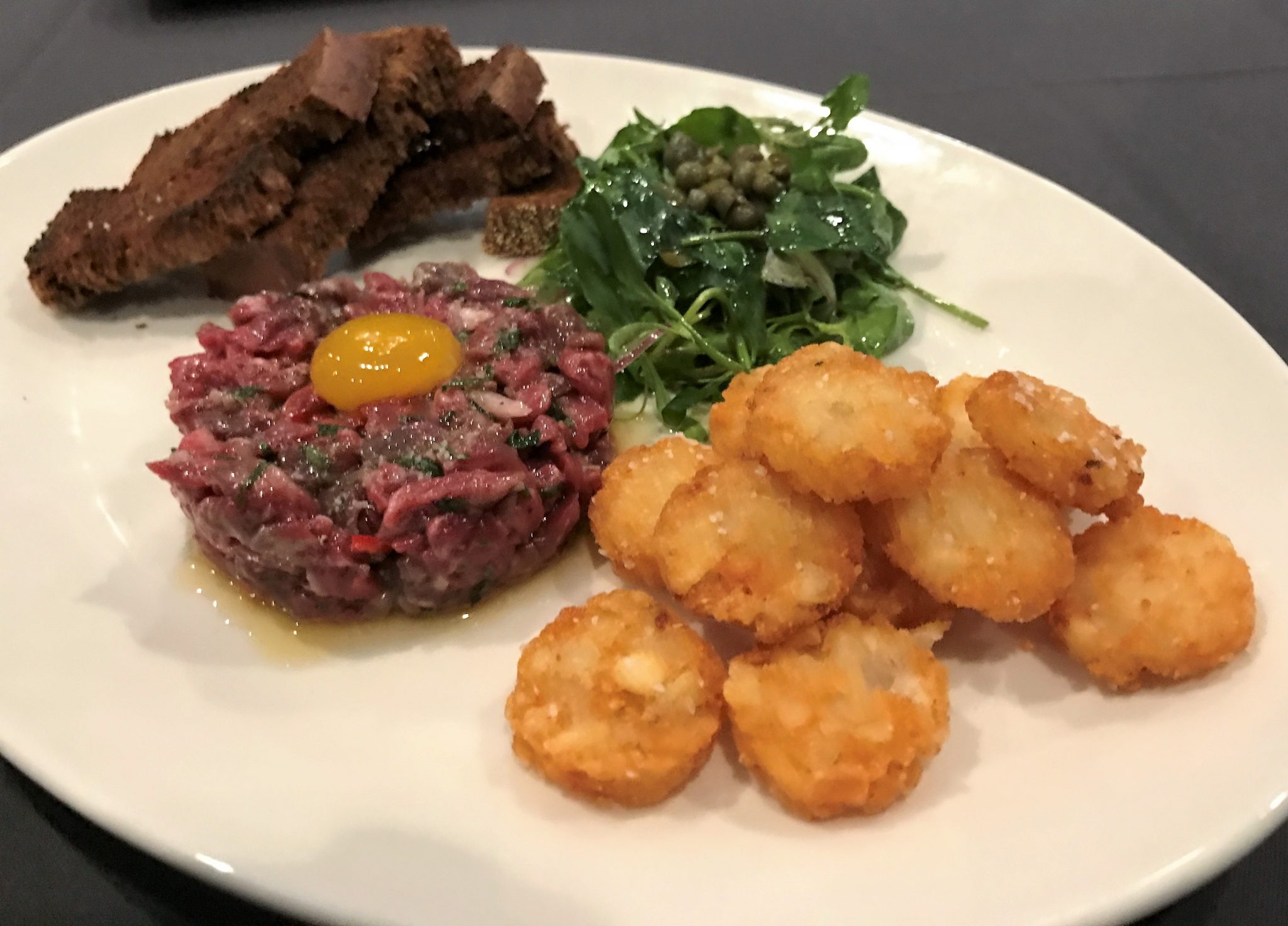 Toasts have become a fun and light way to start off a meal. The new Cowford menu offers a Salmon toast served on pumpernickel with a cream cheese based spread, challots, dill, lemon zest, lemon oil and radish. This is a pleasing way for a seafood lover to kick off a meal. The layering of flavors was subtle and enjoyable. The lemon flavor really comes through without being overwhelming. One of the classic steakhouse appetizers is the steak tartare. Cowford’s is more complex than most with a red onion and watercress salad, pumpernickel bread,  with a salt-cured quail egg on top. It’s served with a side of tater tots. We thought it was delightful. I can’t imagine any steak tartare fan who wouldn’t enjoy this one.