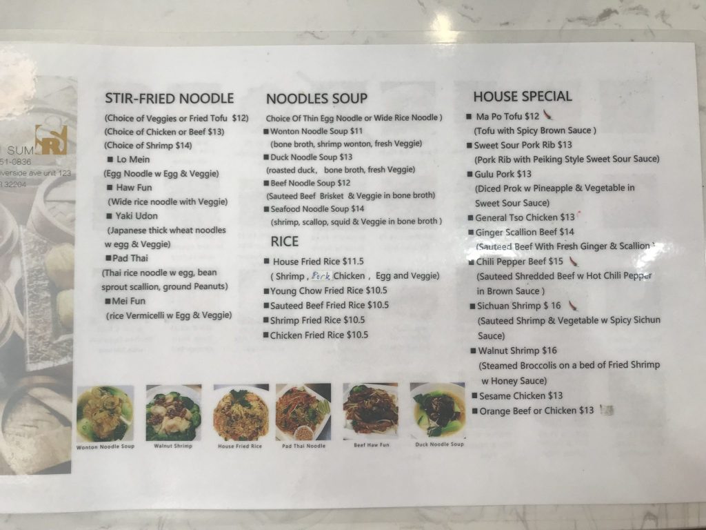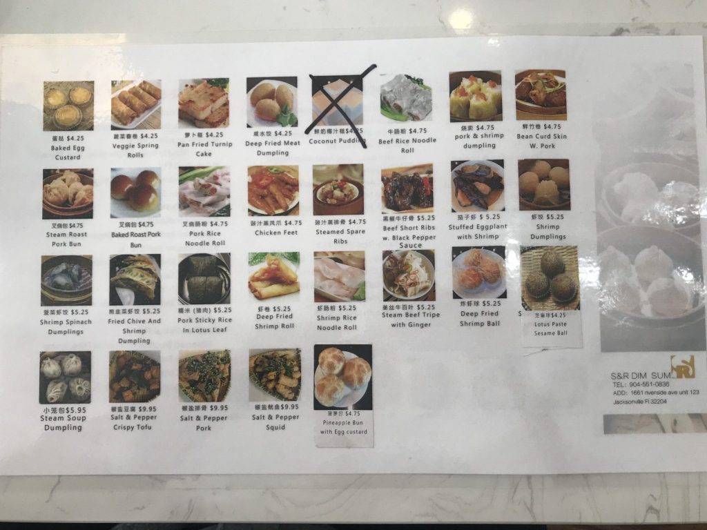 S&R Dim Sum is in the former Tamarind Thai space, which years ago was the Zoe’s Kitchen spot. The address is 1661 Riverside, which is the building S&R Dim Sum is in, but you will find it along Margaret Street. The inside is bright and welcoming, with a casual feel due to the exposed edison lighting and wood plank walls. Maria or Sonny will quickly greet you, find a comfortable spot for you, and take your drink order. The menus have one side with printed rice and noodle dishes. The other side is composed of 30 thumbnail pics of dim sum choices. We focused on the dim sum on our visit to S&R. Instead of waxing poetic, here is a rundown of everything we ate: