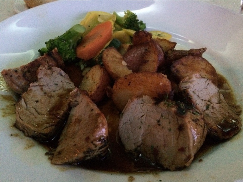 We ordered entrées upon arrival of our gumbo and again the server reminded us the kitchen may get backed up so there would be a wait. His words rang true. The restaurant was probably only at half capacity and we were long finished, with our leftover calamari packed in a to-go container by the time our entrées arrived. With only two of us dining, we would be hard pressed to recommend this as a good spot for a larger group on the weekends. I can only imagine the stress that would add to the kitchen if 8-10 entrées went in at once. We ordered the seafood risotto ($19.95) and the chipotle braised pork tenderloin ($19.95). Note to River City Brewing Company: the word “chipotle” is spelled wrong on your menu. Online and in print. Spelling fanatics everywhere will rejoice if you fix that. The seafood risotto was loaded down with shrimp, scallops, spinach, and tomatoes. The risotto is mixed with a citrus white wine sauce. The risotto is exactly as you’d want it – creamy and stands alone by itself without getting runny. The white wine sauce was superb and added another layer of richness to the risotto. The scallops were tender and buttery. The shrimp were a touch overcooked like the calamari, but not drastically so. I loved how many tomato and spinach pieces were woven throughout the risotto. The only distraction from this dish was a dusting of cheese on top that just did not go well. I wasn’t sure if it was romano or parmesan, but if that had been left off the dish would have been exceptional. Our other entrée, the chipotle braised pork tenderloin is pan seared and sliced, then paired with simple red potatoes and seasonal vegetables. Pork tenderloin is a comfort food for many and this meets that standard. This is fairly thick sliced pork with a gentle rub on the outside. The red potatoes and vegetables weren’t fussy or pretentious – just good, southern vegetables presented like your mom would do for guests.