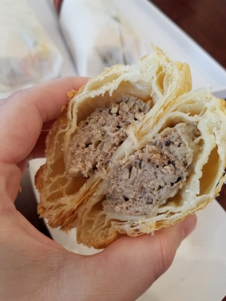 Next, we dove into three different pastries. The first was a grilled pork bun, a Vietnamese treat. The center was a flavorful ball of pork surrounded by flaky pastry. For me, the dough to meat ratio was off. There was overwhelmingly more flaky crust than there was meat. Almost like a box of cereal with a small toy at the bottom of the box. Lots of boring cereal until you get what you want. This pastry was my least favorite thing I tried all day. Although once you got to the pork, it was delicious, the effort to get there was not worth it. After the pork bun we tried the cranberry twist. Visually stunning, it was pastry twisted with pops of red cranberries sneaking through. Buttery with the right balance of sweet and tart. I would definitely order it again. The last pastry we tried was my favorite. It was a caramel brownie cheesecake ($6.50) that was superbly rich, decadent, creamy, and chocolatey dreamy. Complete perfection in my book. My ideal day would consist of sipping on a Paris by Night and noshing on the caramel brownie cheesecake.