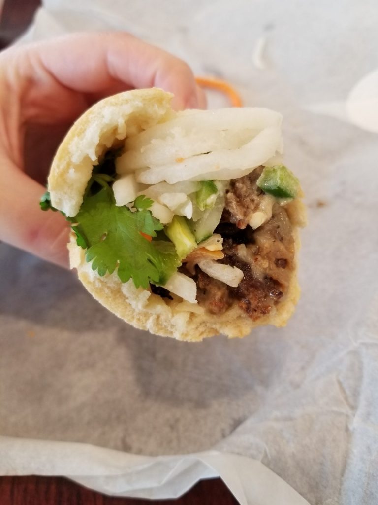 My sister and I were met by warm and smiling employees from behind the counter. The restaurant is built for fast casual, so there are simple tables and chairs throughout, a mural on the walls and across from the bathrooms, and a display of Bruce Tran’s achievements. Paris Bahn Mi was clean with smartly displayed goodies and charming personnel. Nini Tran, niece of Bruce himself, welcomed us and gave us a quick rundown of everything. She was polite, sweet, and patient with our bombardment of questions. She brought us a variety of different menu items so we could experience the whole spectrum Paris Bahn Mi has to offer.